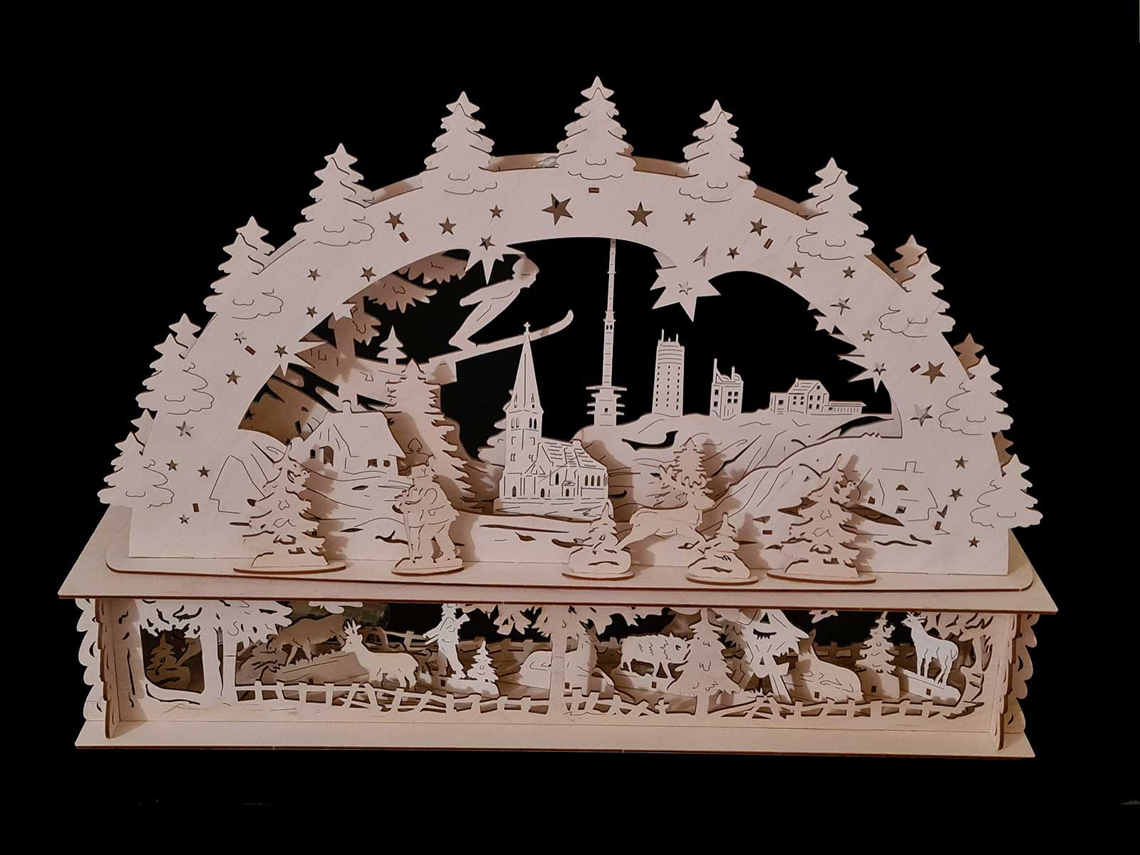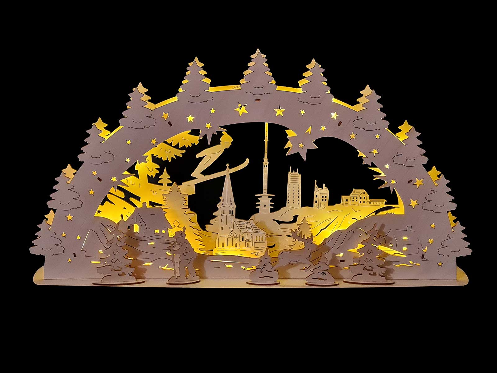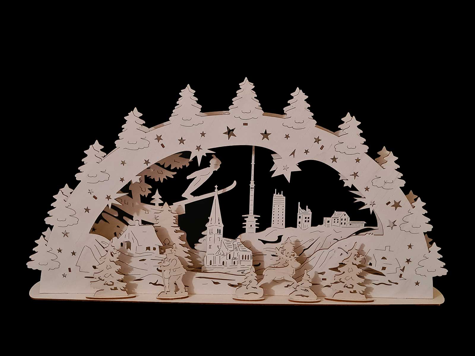 Skispringer mit Schanze, sowie der 916,5 m Hohe Inselberg wurden im ca. 60 cm breiten Schwibbogen festgehalten. Bäume und Waldtiere auf der Sockelplatte sowie zwischen den Blenden runden den Bogen ab. Wahlweise kann in den Bogen die Kirche der Stadt eingearbeitet werden