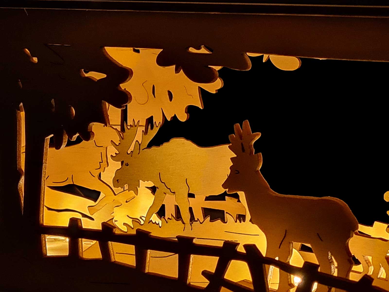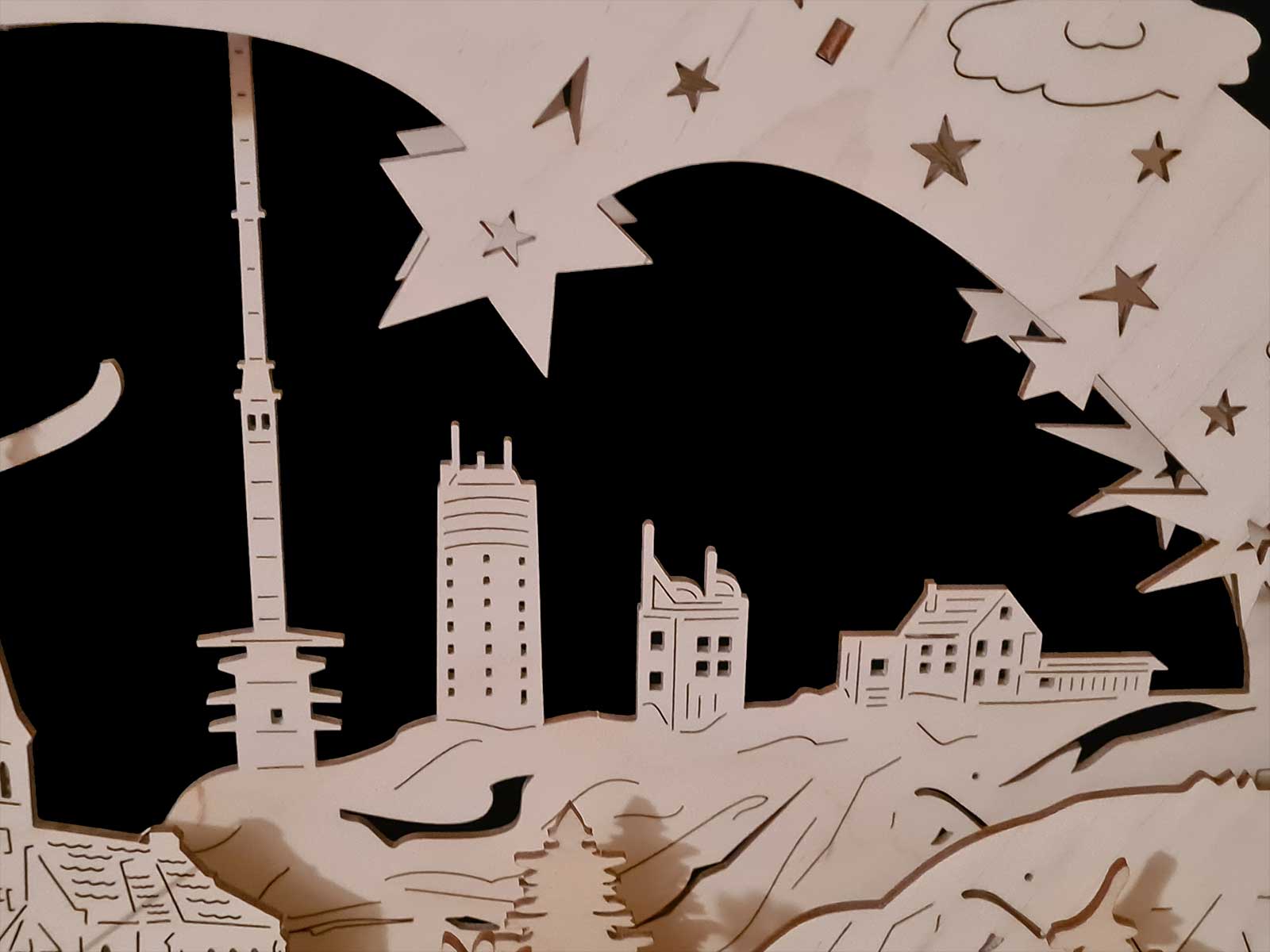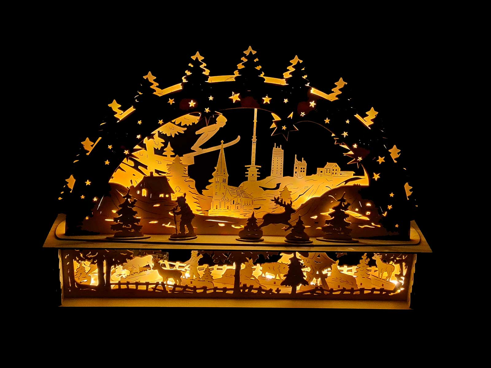 Skispringer mit Schanze, sowie der 916,5 m Hohe Inselberg wurden im ca. 60 cm breiten Schwibbogen festgehalten. Bäume und Waldtiere auf der Sockelplatte sowie zwischen den Blenden runden den Bogen ab. Wahlweise kann in den Bogen die Kirche der Stadt eingearbeitet werden