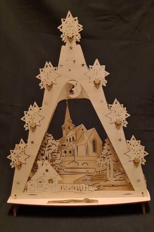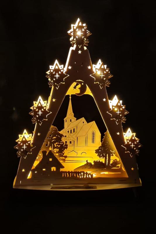 Christes mit seiner Dorfkirche auf dem Lindenhügel haben wir als dreieckigen Schwibbogen bzw. Lichterbaum entworfen.