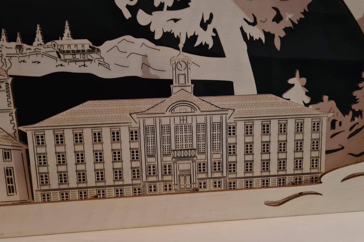 In einer schlichten Baumblende werden der Hausberg sowie bekannte Gebäude von Zella-Mehlis dargestellt.